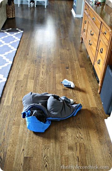 Suddenly that day, a trail of little Bubby stuff started showing up every day right after school. We didn’t have the hat and gloves back then of course, but now we’re graced with their dumpage as soon as he walks in the door: